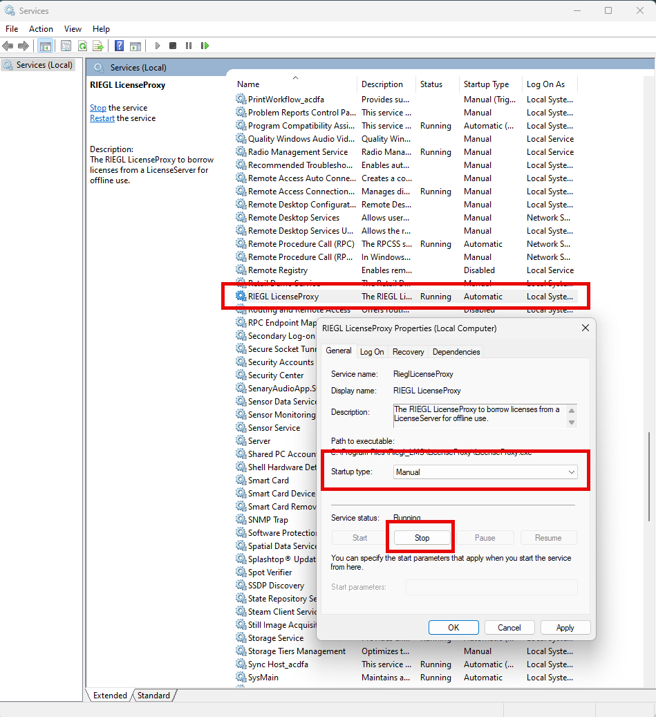 Scroll down the list of services until you reach "RIEGL LicenseProxy". Double-click the service, and change the following settings: