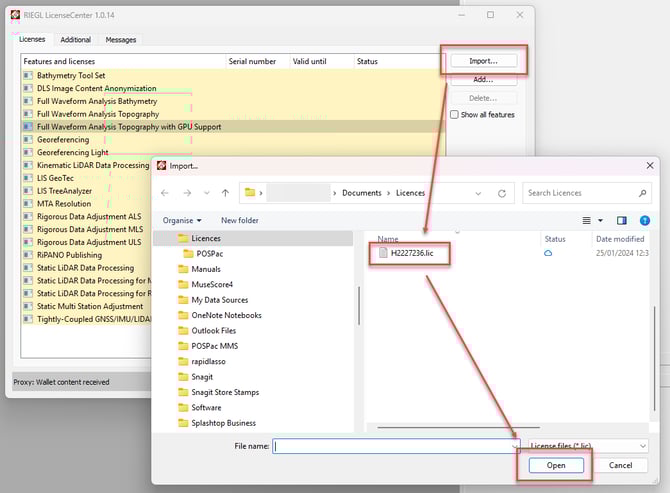 - if you have a .lic file containing the license, click the "Import" button and browse to the .lic file, and click "Open"