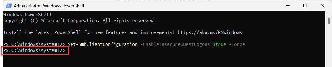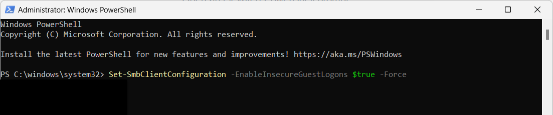 Set-SmbClientConfiguration -EnableInsecureGuestLogons $true -Force