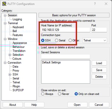 Once downloaded, run PuTTY and type the scanner's IP address into the Host Name field, and ensure the Connection type is set to SSH: