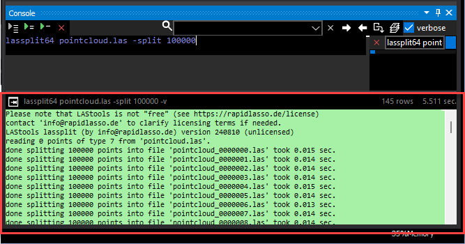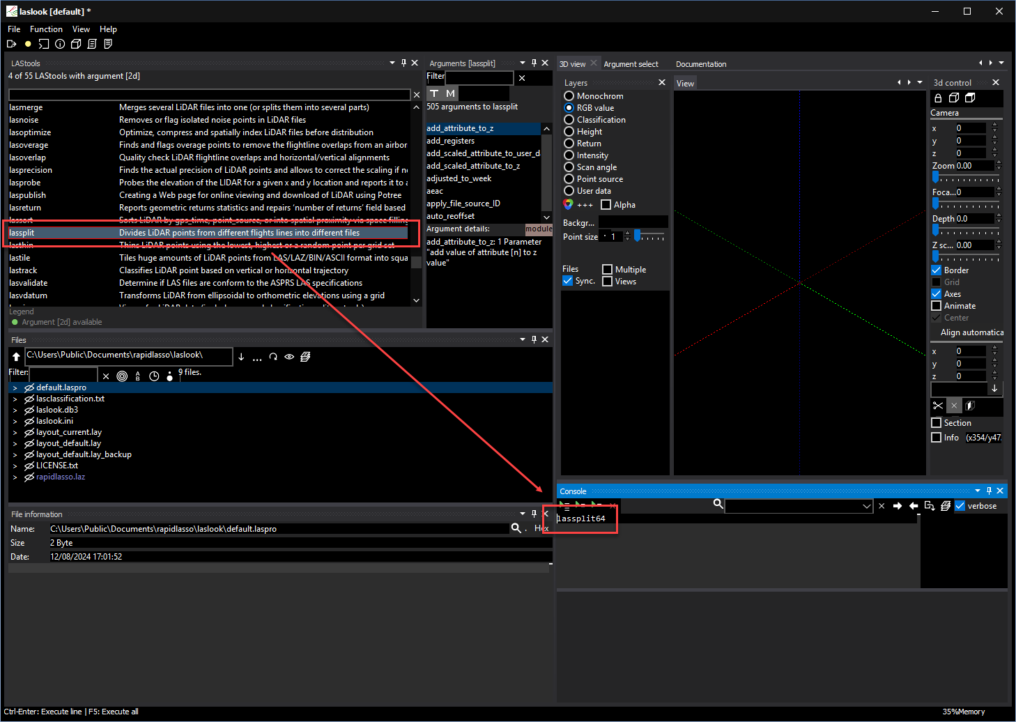 Once open, find lassplit in the list of tools in the panel at the top-left, and double-click it. You will see lassplit64 in the console at the bottom right: