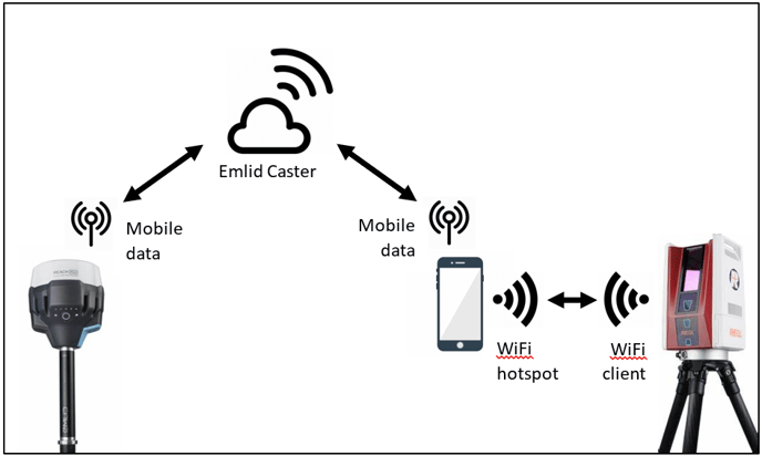 This setup uses Emlid’s free cloud service, called Caster. This service allows you to upload your corrections from your base station to their cloud server, and then download them onto another device anywhere in the world. The Emlid Reach base station requires a SIM card, and the scanner gets its internet connection via a WiFi connection to a mobile phone that is acting as a WiFi hotspot.